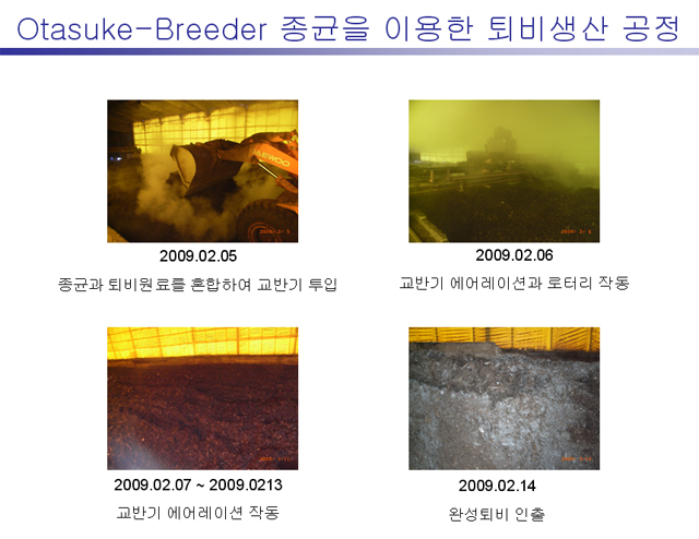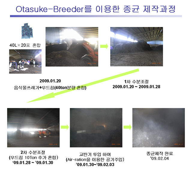 2009年1月20日(有)湖南資源再生で悪臭問題の解決、堆肥品質改善、及び製造期間短縮のために おたすけぶりーだーの種菌堆肥を製造しました。