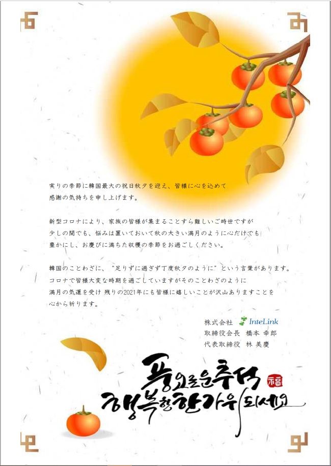 韓国最大の祝日秋夕を迎えご挨拶申し上げます