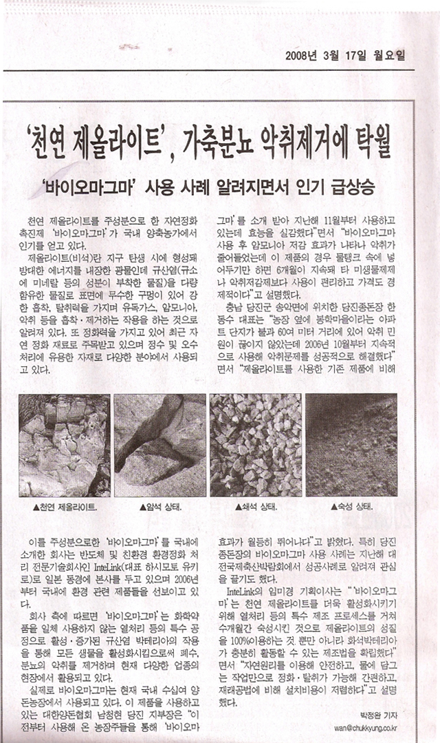 悪臭に対するクレームが後を絶たなかったが2006年10月からバイオマグマを持続的に使用しきれいに解決しました。ゼオライトを使用する既存の製品と比べ効果が優れている。”と述べた。