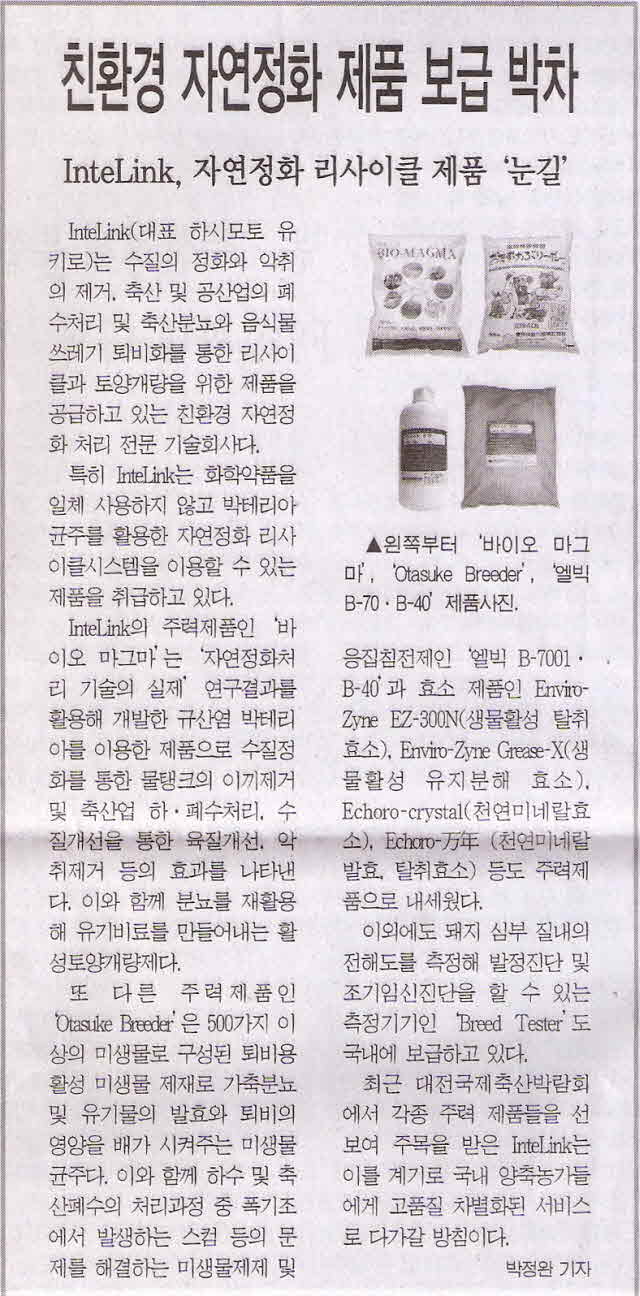 2009年10月12日、2009年大田国際畜産博覧会出展と多様な分野に適用される当社製品に関する記事が韓国畜産経済新聞に掲載されました。