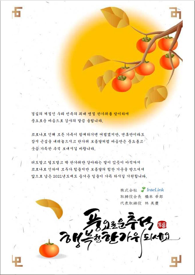 따뜻한 정이 가득한 추석연휴 되시길 기원드립니다.