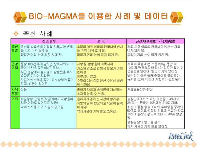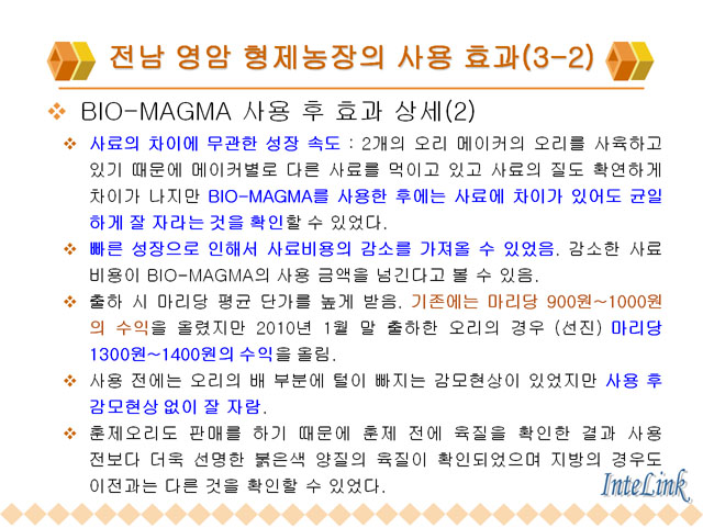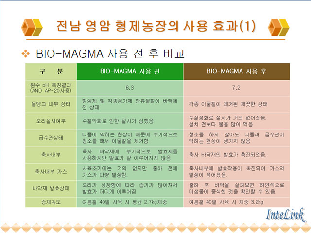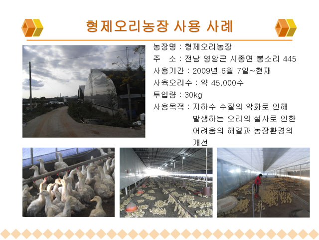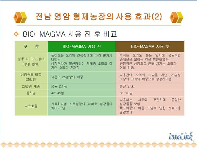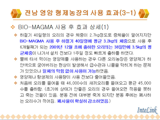 다음 자료는 전남 영암군의 형제오리농장의 BIO-MAGMA 적용사례입니다.